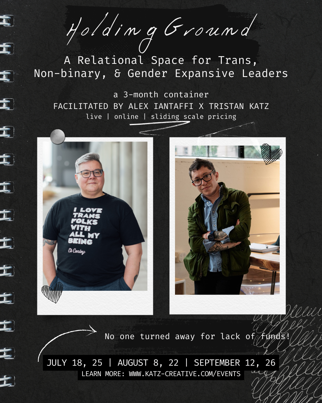 Facilitated by Tristan Katz and Alex Iantaffi, this circle invites trans, non-binary, and gender expansive leaders to gather in mutuality—to be witnessed, to process, to build genuine relationships, and to practice collective care.